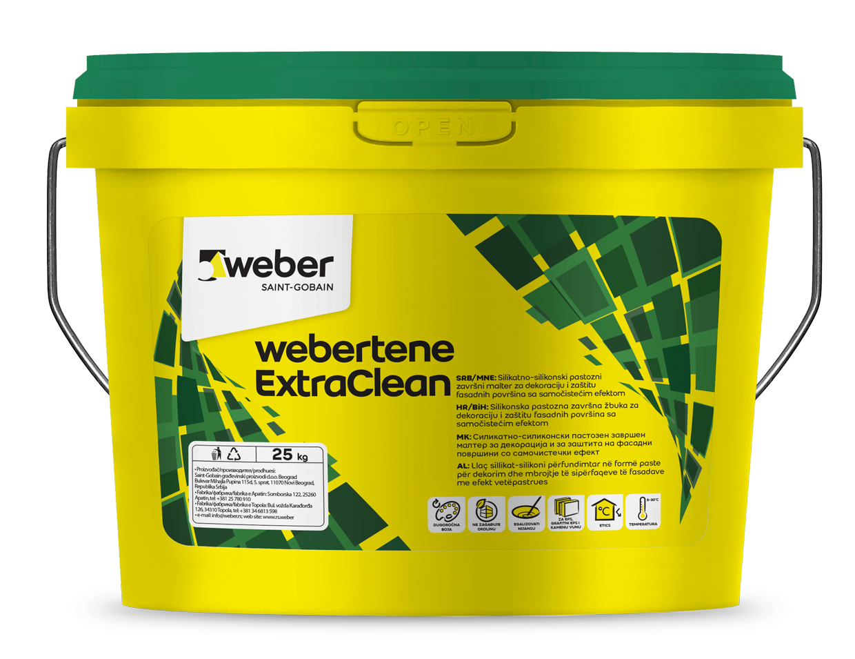 weber.pas extraClean je tankoslojna dekorativna žbuka s progresivnim efektom samočišćenja. Spaja sve pozitivne strane silikonskih i silikatnih mortova. Upotrebom jedinstvenih svojstava čestica, sve pozitivne strane obje vrste fasada kombiniraju se u jednu.